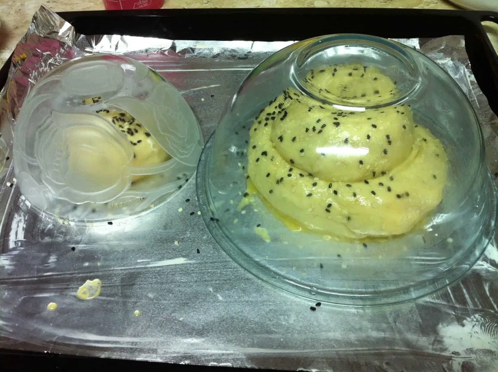 Challah fermentando baixo de uma tigela de video e um Challahzinha pequena que fiz do resto da massa, que sobro 🙂